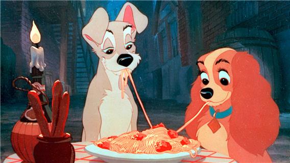 Tramps Werben um Lady geht schnell, aber die Liebe erblüht, als die italienischen Kellner ihnen ein Ständchen bringen und ein Spaghetto sie zum ersten Kuss zusammenführt.